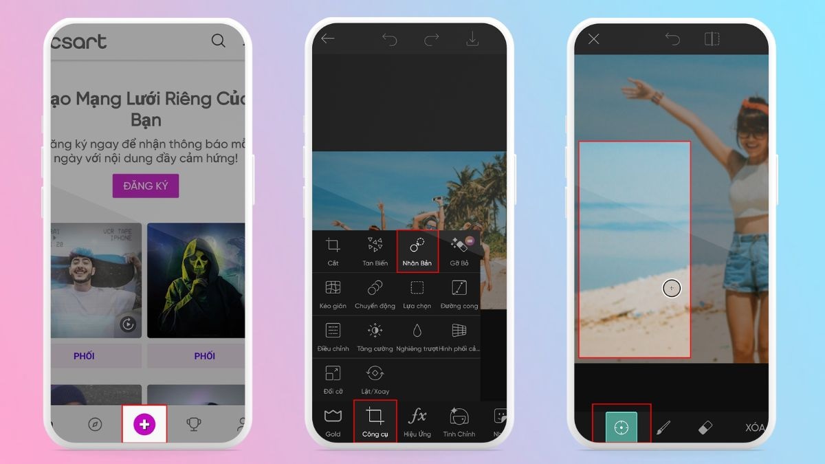 - Bước 1: Mở ứng dụng PicsArt trên điện thoại và nhấn vào hình dấu “+” ở cuối màn hình. Sau đó bạn chọn hình ảnh muốn chỉnh sửa. Chọn tiếp vào tab “Công cụ” ->> “Nhân Bản” như dưới màn hình